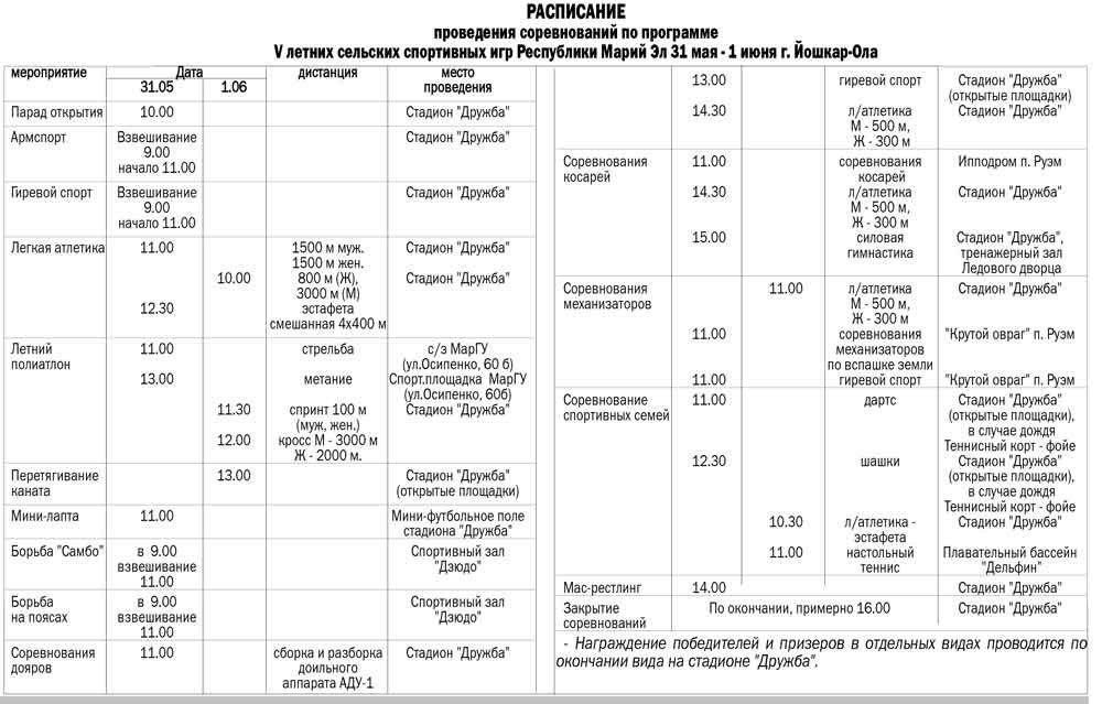 В выходные дни, 31 мая и 1 июня, в Йошкар-Оле состоятся V летние сельские спортивные игры Марий Эл, в которых примут участие команды районов республики. На соревнованиях будут определены победители в 13 видах спорта. По их итогам лучшие спортсмены войдут в сборную команду республики. В июле она представит Марий Эл на X Всероссийских летних сельских спортивных играх в г. Нововоронеже Воронежской области.