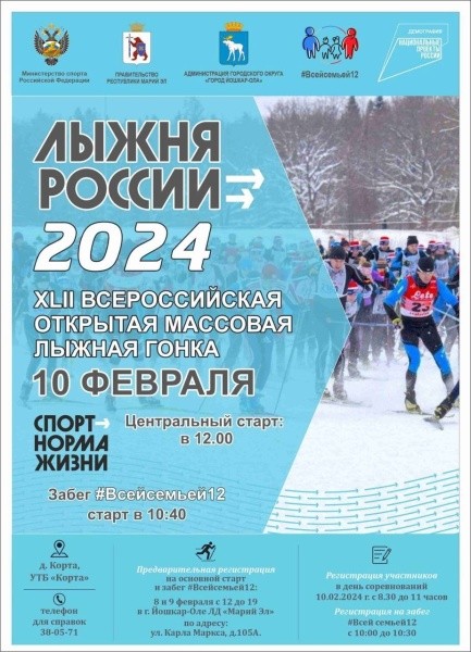 В рамках «Лыжни России» состоится семейный забег #Всейсемьей12. Он пройдет с 11:00 до 11:45, до начала основного старта, поэтому и регистрироваться на забег нужно раньше – с 8:30 до 10:00. В этом забеге принимают участие семейные команды, состоящие из 2-4 человек. В команде обязательно должен быть 1 взрослый и 1 ребенок до 12 лет.