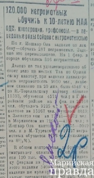 "По г. Йошкар-Ола задание по ликбезу - обучить 287 неграмотных. Задание это перевыполнено. На 1 февр. в городе обучилось 316 неграмотных.