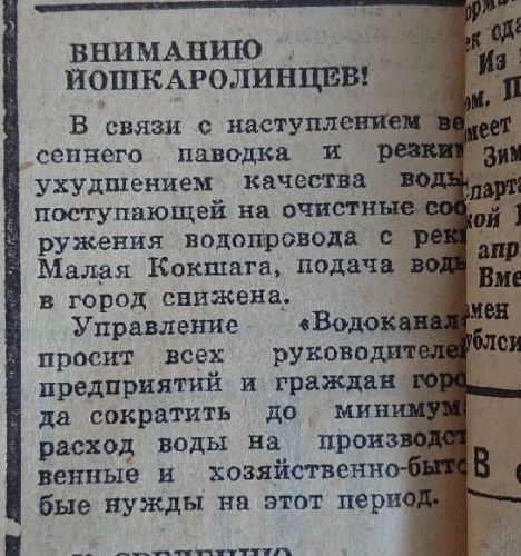 "В связи с наступлением весеннего паводка и резким ухудшением качества воды поступающей на очистные сооружения водопровода с реки Малая Кокшага, подача воды в город снижена.Сегодня горожане далеки от этих проблем, качество воды в столице Марий Эл одно из лучших в стране. В 1974 году йошкаролинцев предупреждали о традиционном весеннем ухудшении качества воды, но вместе с тем мы знаем, что тогда же по инициативе председателя горисполкома Евгения Зотова уже шли работы по строительству арбанского водозабора.