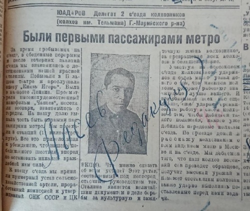 24 февраля 1935 года газета "Марийская правда" рассказала о поездке в Москву делегата 2 съезда колхозников Юадарова из колхоза имени Тельмана в Горномарийском районе.