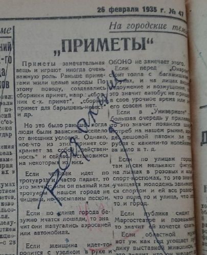 Откроем номер «Марийской правды» от 26 февраля 1935 года. На 4 странице опубликован материал «Приметы», под рубрикой «На городские темы», здесь по шуткам редакции мы видим актуальные для йошкаролинцев проблемы того времени.