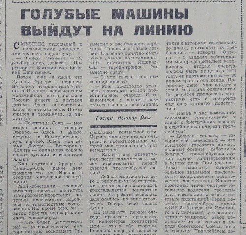 Пройдет еще несколько месяцев, и по трассе первой очереди йошкар-олинского троллейбуса двинутся голубые машины. В этом будет частица труда и автора проекта — уроженца Испании, гражданина СССР Эухеньи Эрреро.
