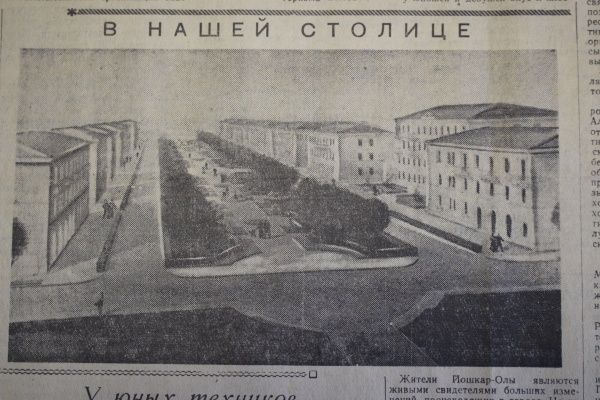 На этом снимке изображен проект нового Зеленого бульвара, связывающего парк культуры и отдыха с набережной реки Кокшаги. Центральная озелененная часть бульвара предназначается для отдыха трудящихся. По ней пройдет прогулочная аллея со скульптурными группами, удобными скамьями, цветниками и клумбами. С Советской улицы в сторону набережной бульвар откроется памятником основоположнику марийской литературы С. Г Чавайну, который будет установлен в центре аллеи.