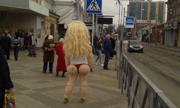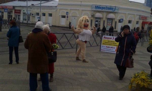 Здоровенный синяк на пятой точке привлекал внимание прохожих. Ростовая кукла рекламировала на улицах Краснодара какие-то биодобавки, при этом показывая своим видом, какой эффект может быть от них. Если честно, то не хотелось бы стать таким же.