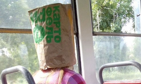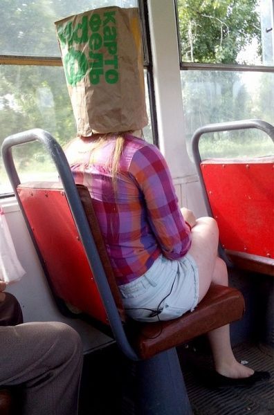 Девушка, по-видимому, чересчур перегрелась на солнышке возле окна в трамвае Волгограда. И не придумала ничего лучше, чем быстренько скушать всю картошку фри из пакета, после чего - надеть пакет на голову. Смекалистый у нас народ, все ему нипочем.