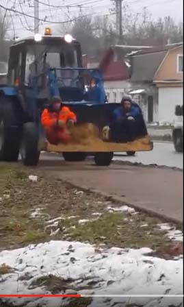 В Калуге изворотливые коммунальщики обрабатывают улицы с помощью новой методики «два гастарбайтера в одном ковше». Посадили двоих бедолаг в ярких оранжевых робах в ковш бульдозера и заставили ручонками песок на дорогу рассыпать. Лепота!