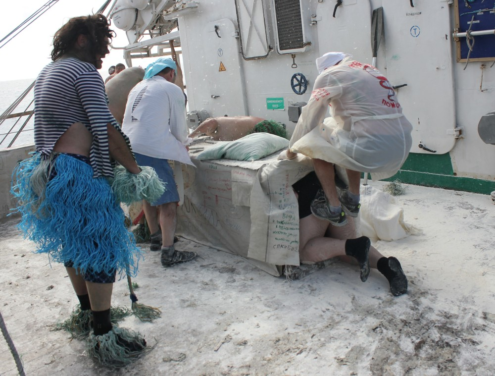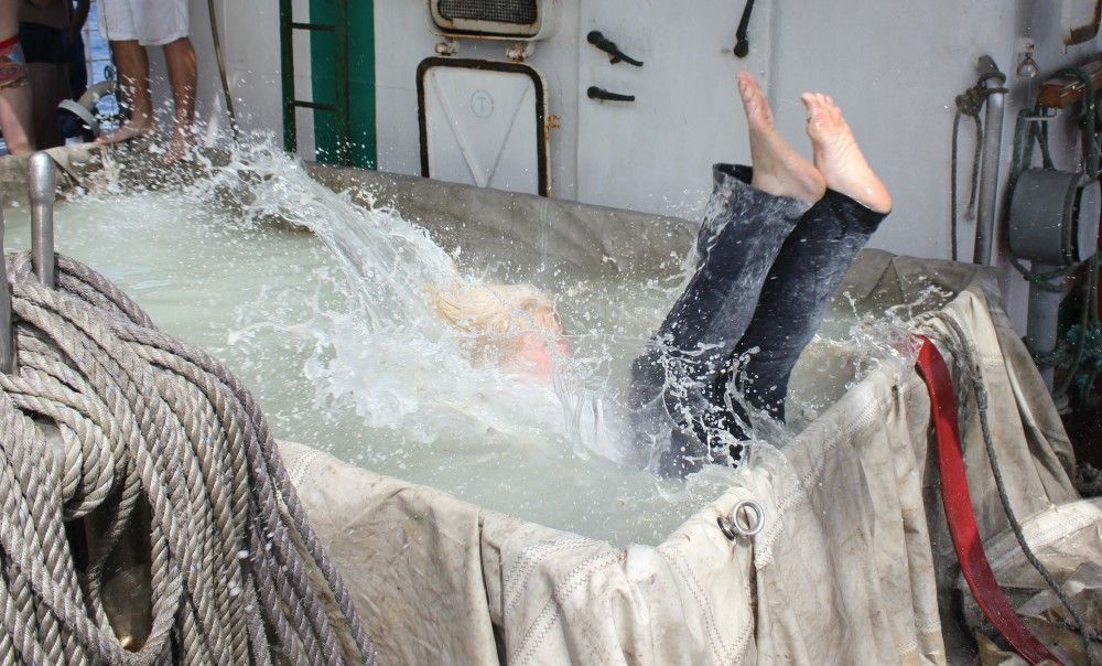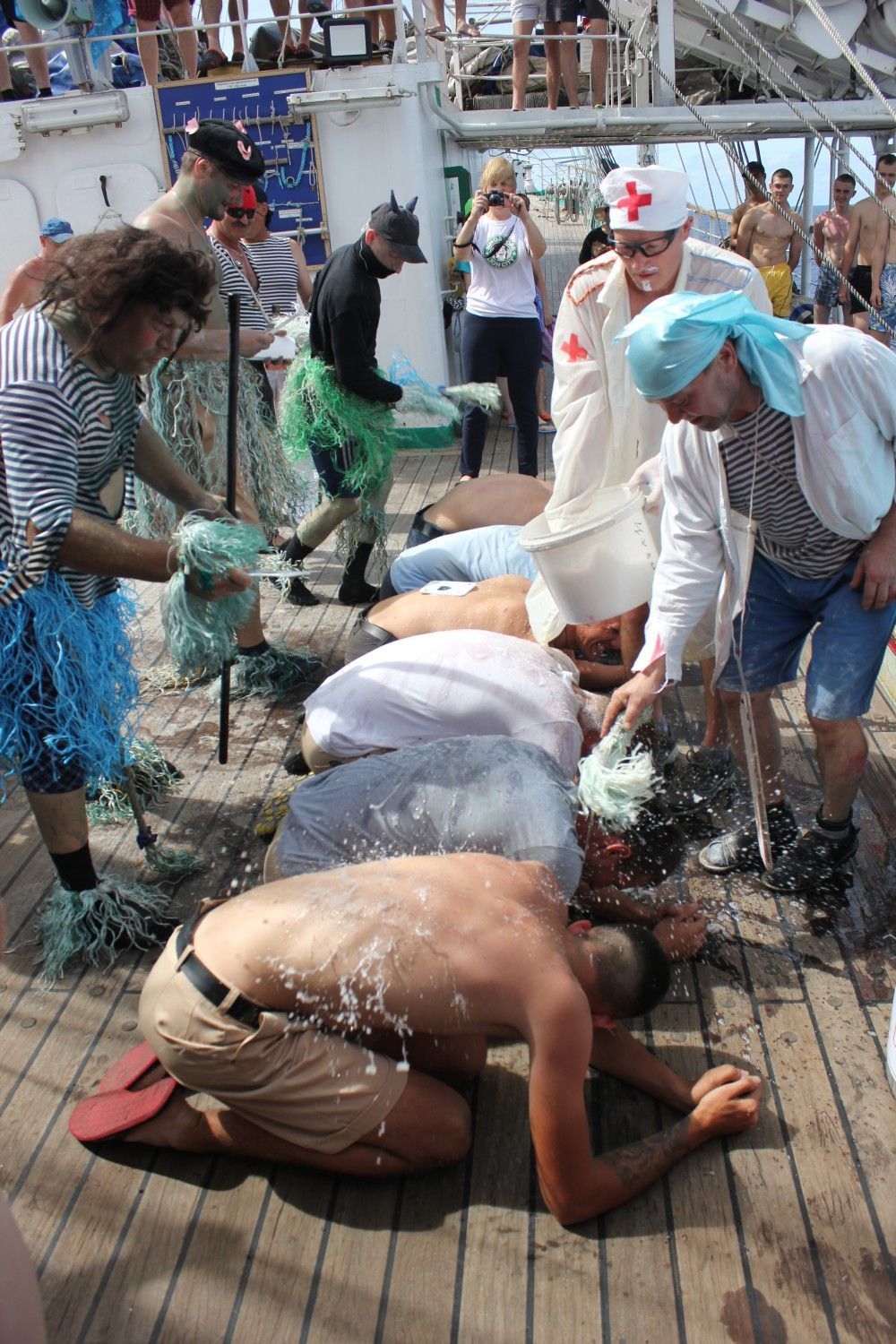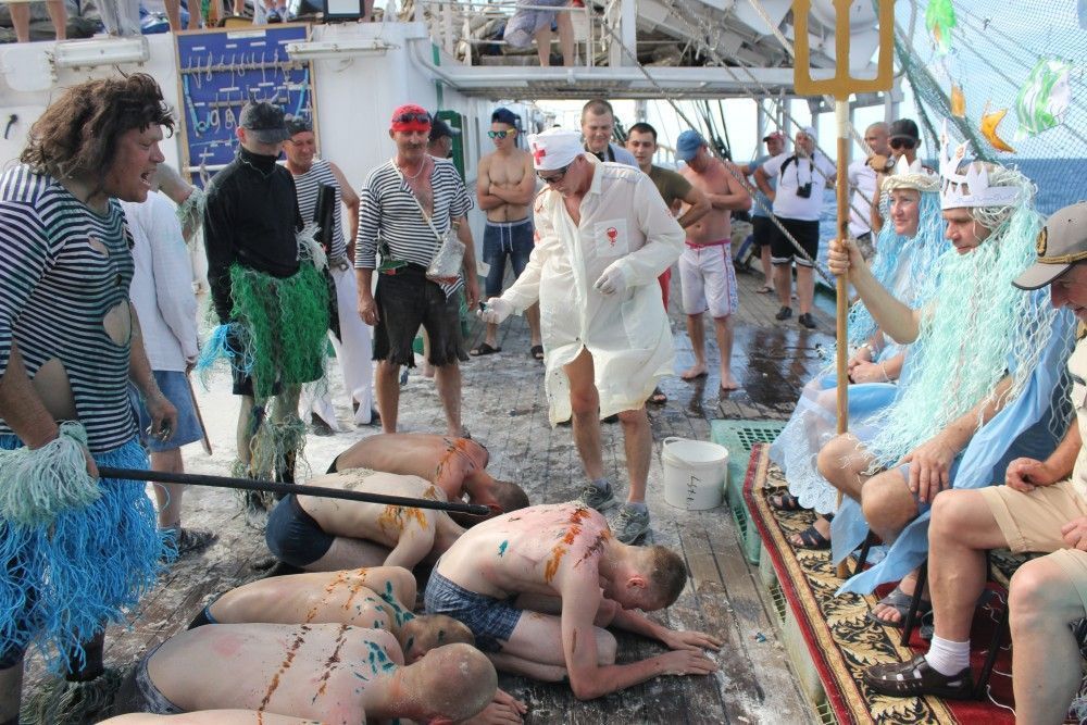 Черти и пираты устраивали будущим мореманам такие испытания, что те, перемазанные зелёнкой, мукой и все в перьях, сами окунались в купель с забортной водой.