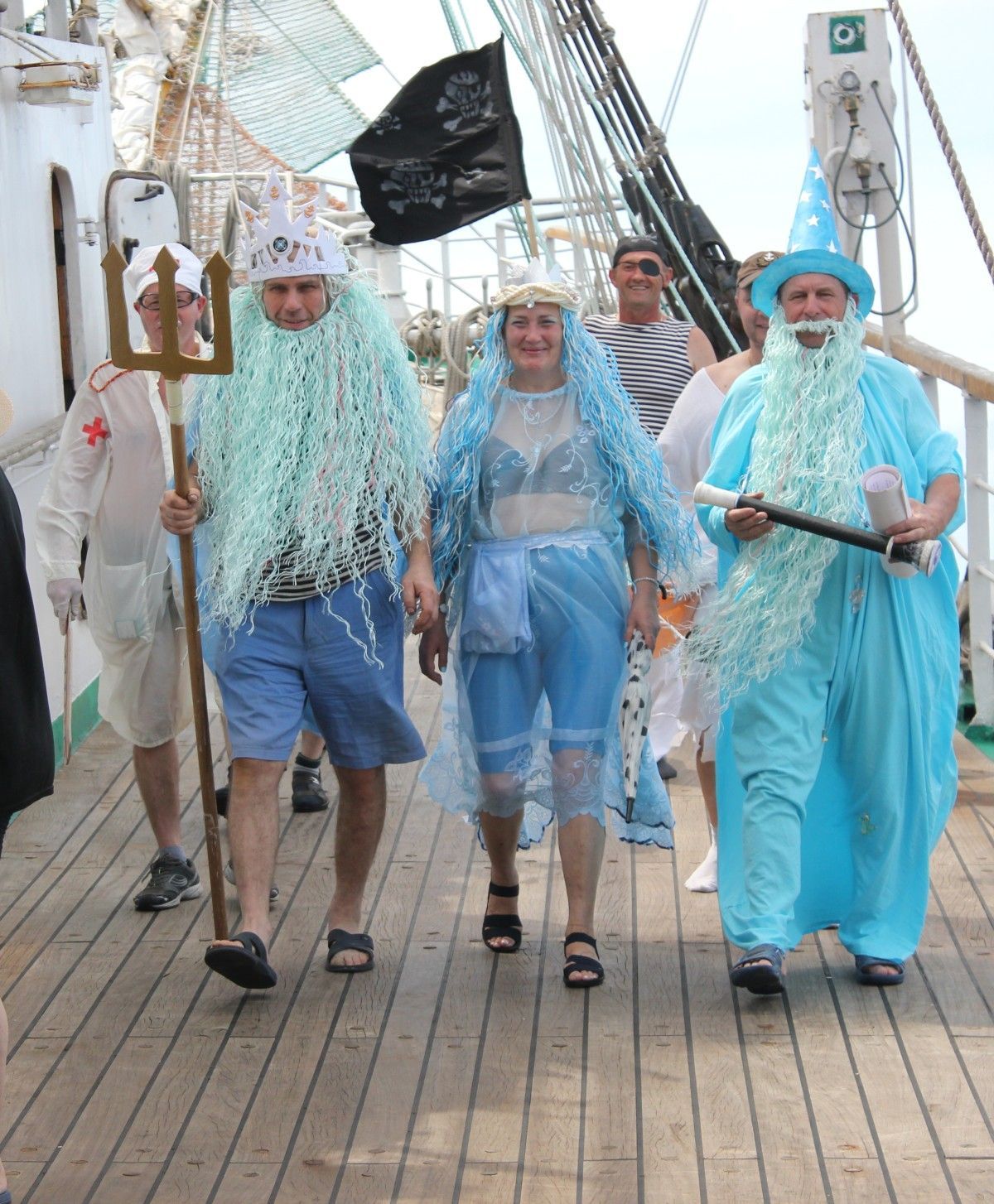По морской традиции это событие на любом судне отмечается праздником — Днём Нептуна. Бывалые моряки устраивают театрализованное представление, цель которого оставить у экипажа судна в памяти это знаковое событие и положительно настроить всех моряков на преодоление трудностей, с которыми можно столкнуться в дальнем плавании. Вот и на «Палладе» - хранительнице всех добрых флотский традиций, на протяжении двух с половиной часов в этот праздничный день главным действующим лицом был Владыка всех морей и океанов - Нептун (под присмотром капитана, конечно). Веселить и забавлять народ Морскому Владыке помогала его многочисленная свита: Русалка, Звездочёт, Доктор Айболит, Брадобрей, Виночерпий, пираты и черти.