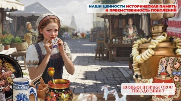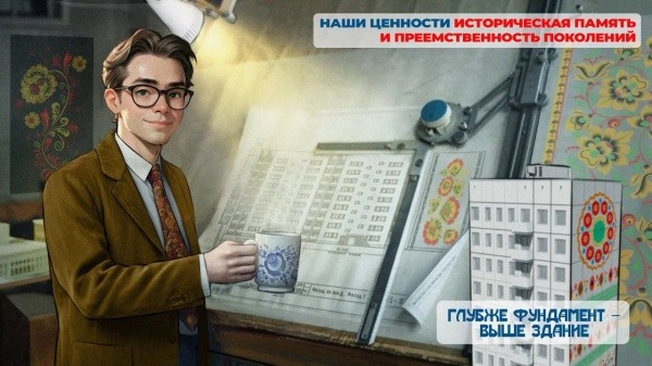 «Конечно, само понятие исторической памяти и преемственности поколений глубже и объемнее, но, если наши картинки помогут запустить дискуссию между поколениями и личное осознание ценностей – своей цели мы достигаем, - отметили иллюстраторы. - Историческая память и преемственность поколений ‒ яркая нить народных орнаментов и росписей, которая соединяет поколения в трех эпохах, показывая, как ценности прорастают и сохраняются в исторической перспективе. От девочки, играющей на сопелке на разноцветной ярмарке в стародавние времена – к использованию элементов народной росписи в советской архитектуре и появлению традиционных мотивов на ливрее современного самолета. Даже то, что современные девушки сейчас носят кокошники – вводит традиции в повседневный контекст, и логично, что наша историческая память и преемственность поколений связаны с трудом, сплачивающим нацию».