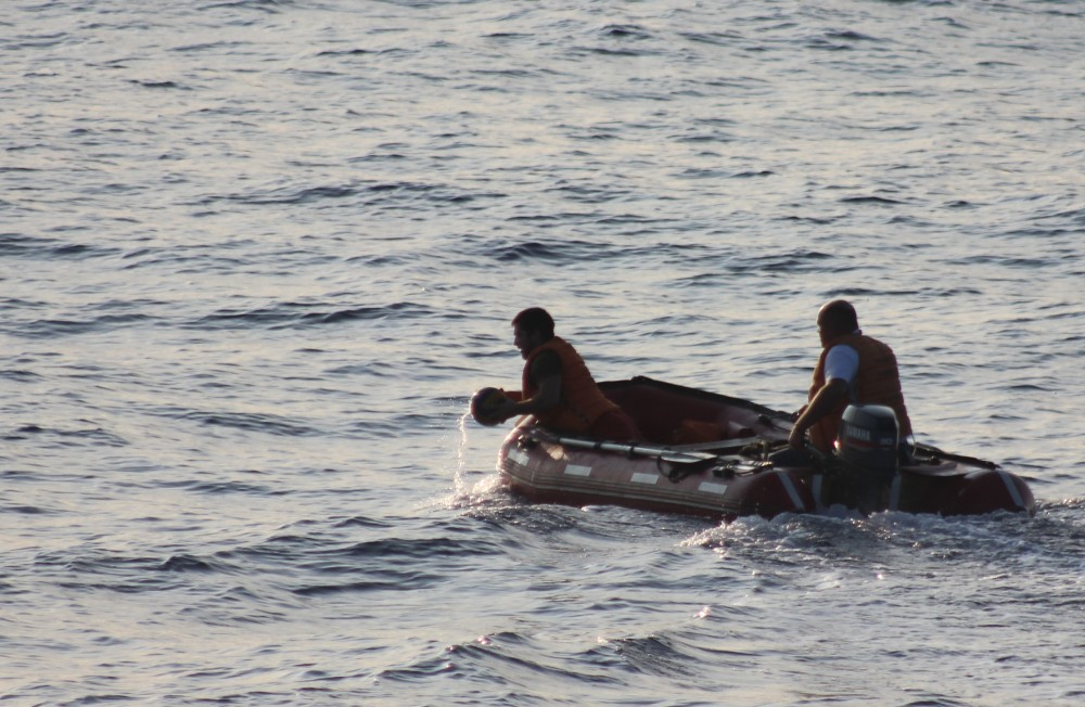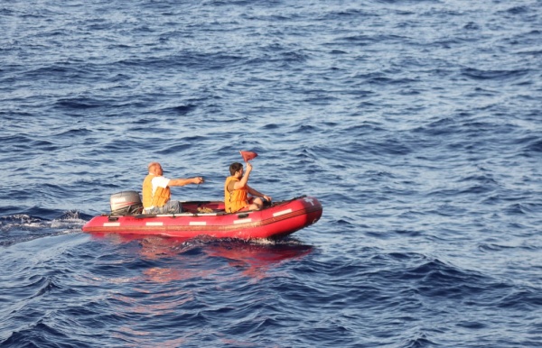 В один из дней вдруг неожиданно прозвучал сигнал тревоги «Человек за бортом». Учебный. Согласно алгоритму действий по тревоге «Человек за бортом» судно совершило циркуляцию и стало ложиться на обратный курс. «Паллада» шла под косыми парусами и поэтому, одновременно со спуском дежурной спасательной лодки, палубной команде и практикантам необходимо было спустить паруса. Паруса спустили достаточно быстро и спасательная команда во главе со старшим штурманом Романовым Константином Владимировичем на спасательной лодке направилась к упавшему за борт.