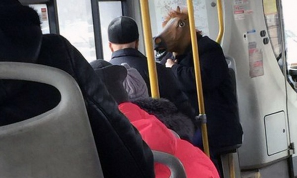 Парень зачем-то надел маску коня и сел в трамвай (на фото).
