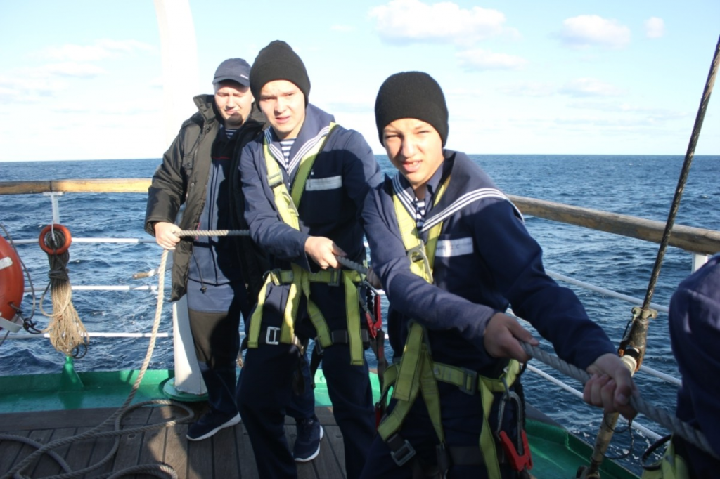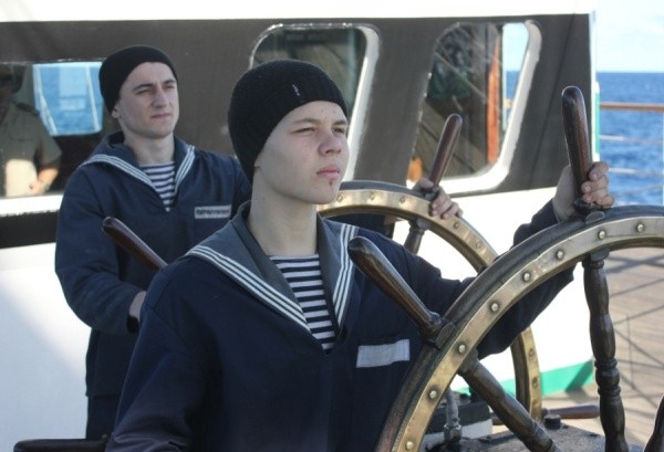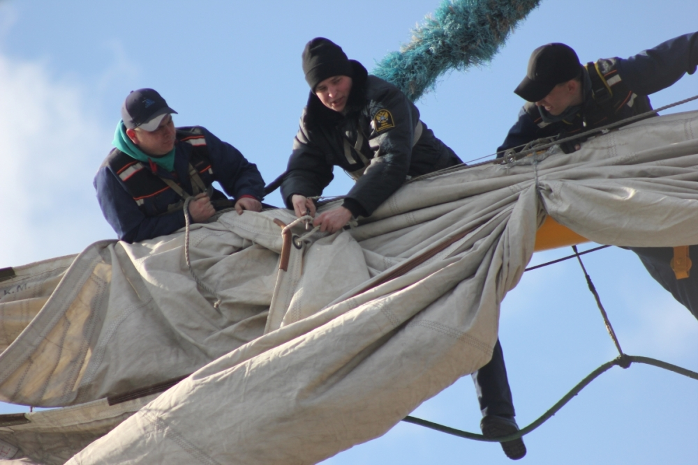Прозвучал сигнал парусного аврала. Практиканты надели страховочные пояса и построились по мачтам. Каждый у той, где приписан. Обычное ребячество и баловство сразу куда-то подевались. После дополнительного инструктажа прозвучала команда с мостика: «… Марсовые, к правым вантам! Пошёл наверх! Проходим через марсосалинговую площадку и спускаемся вниз по левым вантам! Соблюдаем осторожность и дистанцию!» Курсанты и юнги по одному начали подниматься по вантам на мачты. Боцмана с верхней палубы указывают им на ошибки, подсказывают, как нужно делать правильно. Матросы находятся на марсосалинговой площадке («на марсе») и страхуют всех на переходе. Высота до марса почти 15 метров от воды (пятиэтажка). Появился первый неуверенный в себе курсант. Он остался на верхней палубе: насильно подниматься на высоту никого не заставляют. Чуть позже боцман попробует подняться на мачту вместе с ним. Если у парня получится побороть страх, то потом толк будет. А юнги поднялись наверх без проблем, и только внизу признались, что было страшновато (мягко сказано). Но все как один заверили, что в следующий раз пойдут на мачту ещё. Они уже знают, что выше марса есть ещё салинг, брам-салинг и бом-брам рей, а чтобы стать настоящим моряком - эти высоты тоже нужно покорить.