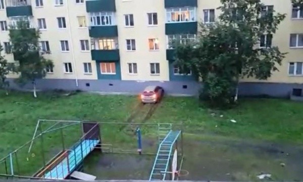 По наезженной колее, оставленной этим авто на зеленой траве, понятно, что таких подъездов было гораздо больше, чем жильцы успели запечатлеть на видео.