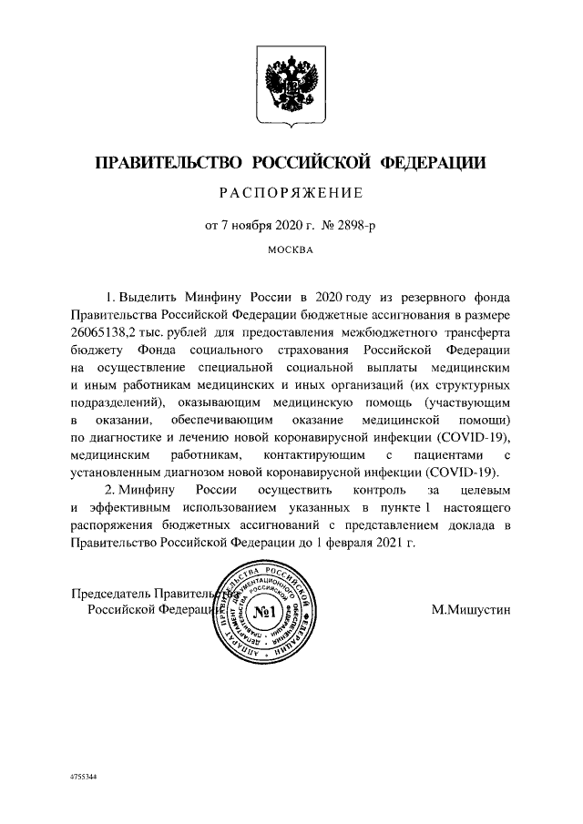 Согласно распоряжению Правительства России от 7 ноября, из Минфину РФ из резервного фонда выделяются средства в размере 26065138,2 тысяч рублей на социальные выплаты медработникам, которые работают с больными коронавирусом.