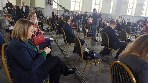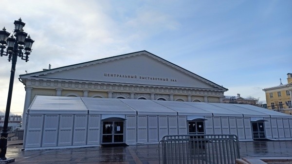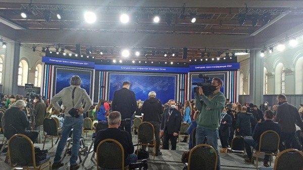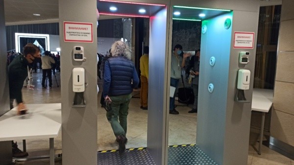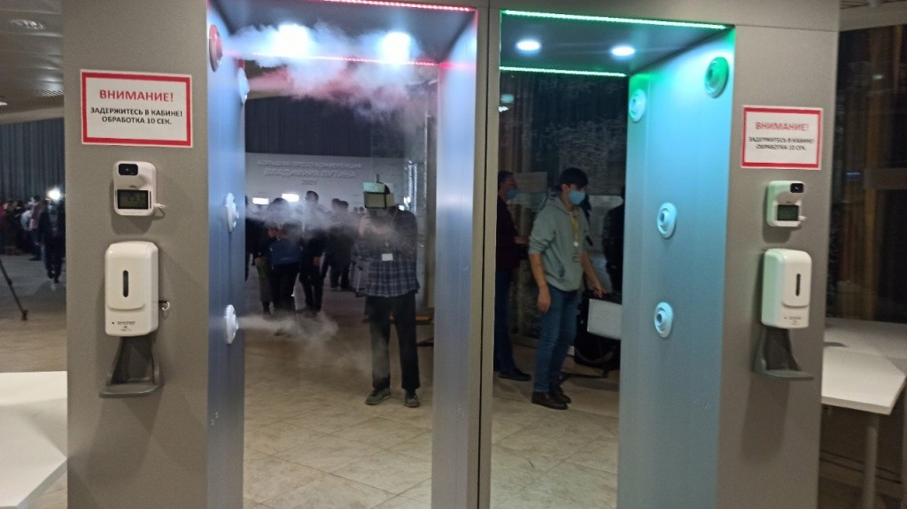 В нижнем холле здания работает пресс-центр, здесь же организован фуршет для приглашенных журналистов. Каждый представитель СМИ перед входом в зал проходит термометрию (у нашего журналиста - 36,6) и тотальную дезинфекцию, которая представляет собой рамку с четырьмя форсунками, из которых выбиваются пары, не содержащие спирт, в них - катионы серебра.