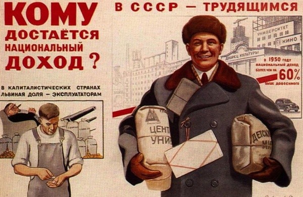 Низкий уровень оплаты труда, за счет этого — «бесплатные» медицина, образование, частично спорт, отдых и т.п., низкий уровень сбережений, их регулярные отъемы (денежные реформы, прямые изъятия, принудительные займы, их дефолты). Вечно отстающая «социалка». Горбачев: «Привыкли смотреть на народ, как на дешевый товар, как на рабочую силу».