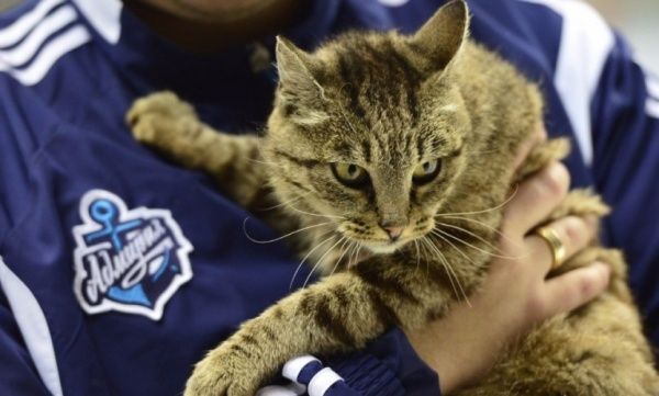 Матроска прославилась после того, как забралась в витрину рыбного магазина в аэропорту Владивостока и съела там деликатесов примерно на 60 тысяч рублей. Позже кошку приютил "Адмирал", поселив ее на "Фетисов-Арене" и сделав своим талисманом.