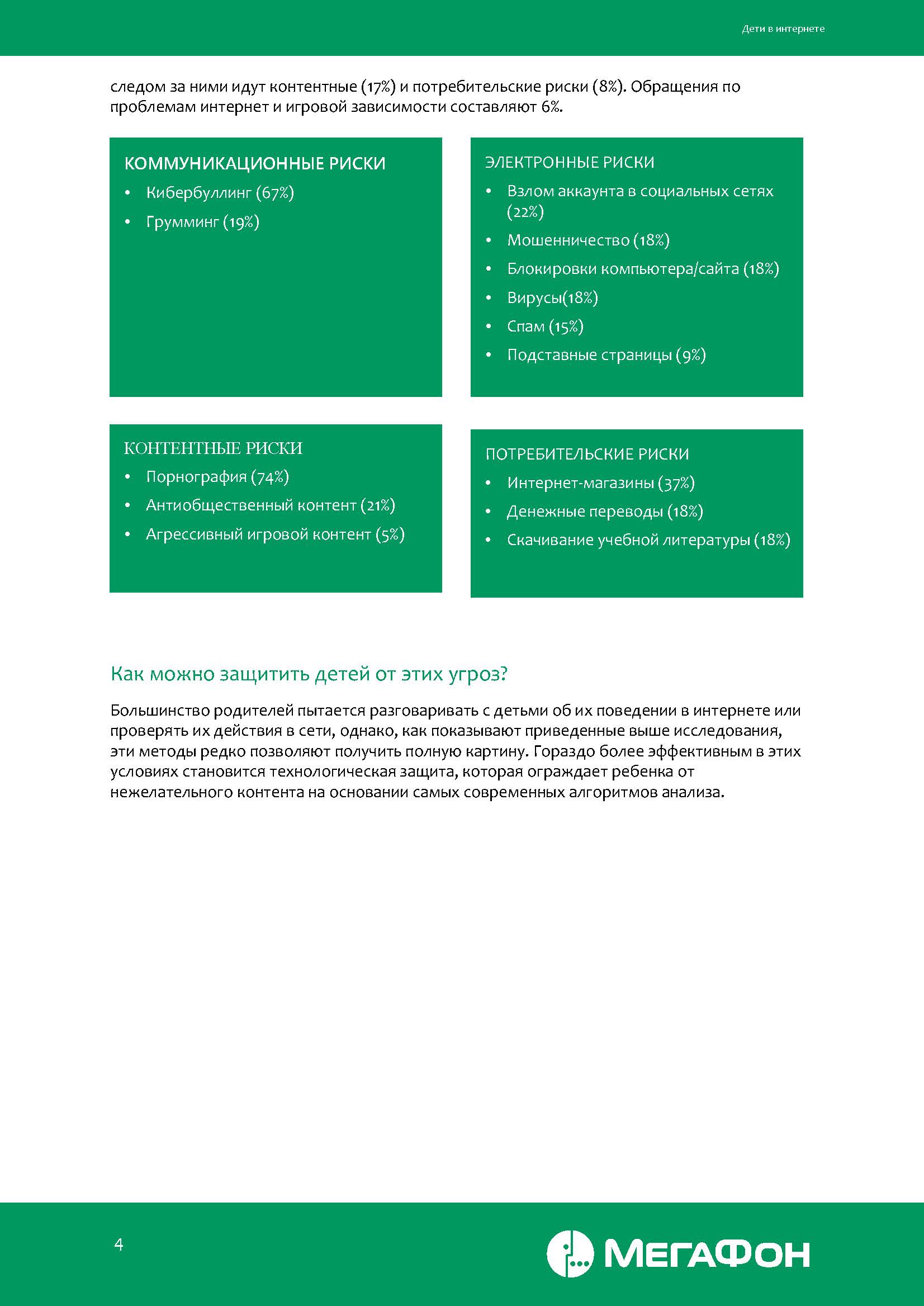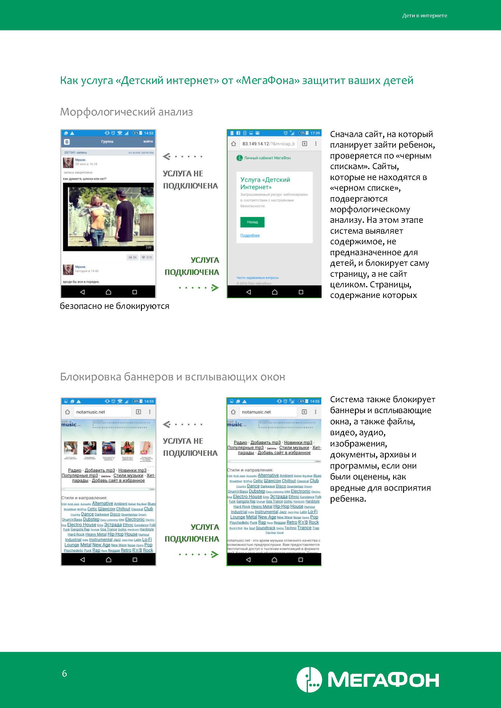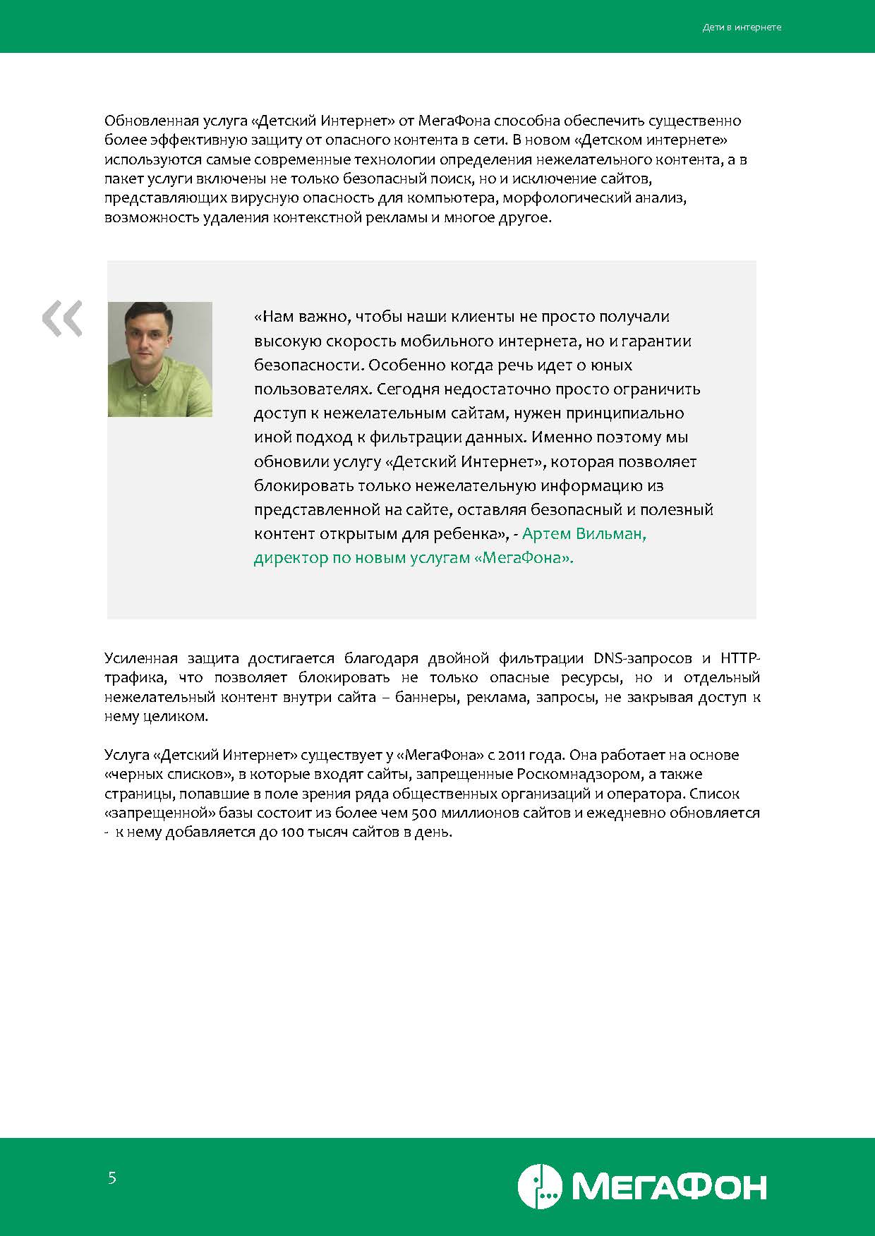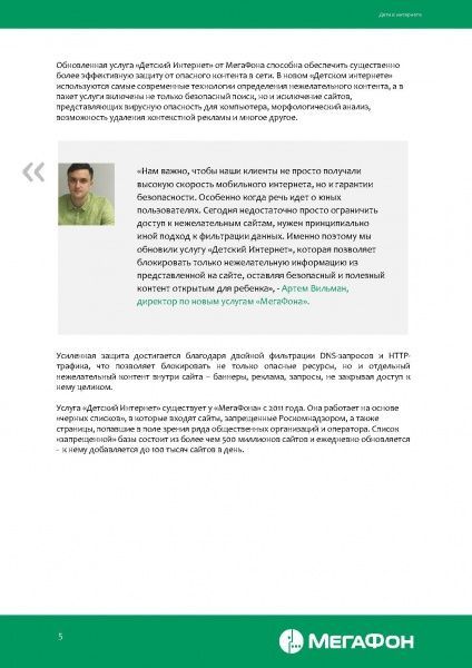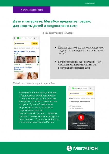 Обновленная услуга "Детский Интернет" от МегаФона способна обеспечить существенно более эффективную защиту от опасного контента в сети. В новом "Детском интернете" используются самые современные технологии определения нежелательного контента, а в пакет услуги включены не только безопасный поиск, но и исключение сайтов, представляющих вирусную опасность для компьютера, морфологический анализ, возможность удаления контекстной рекламы и многое другое.