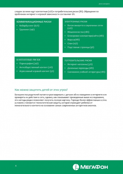 По данным линии помощи "Дети Онлайн", помогающей подросткам справиться с проблемами, возникшими у них в интернете, чаще всего обращения связаны с коммуникационными рисками (45%). На втором месте стоят электронные риски (30%), следом за ними идут контентные (17%) и потребительские риски (8%). Обращения по проблемам интернет и игровой зависимости составляют 6%.