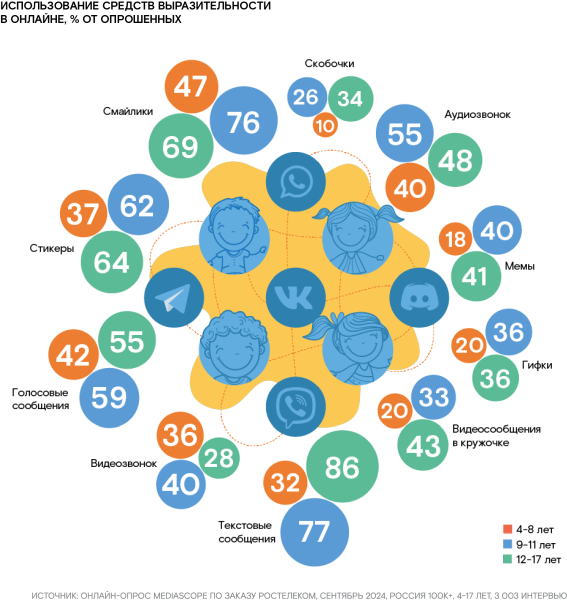 Современные дети, представители поколения Альфа, выросли в цифровом мире и прямом контакте с технологиями, которые сразу стали неотъемлемой частью их жизни. Это влияет на их восприятие мира, ожидания от общения и способы потребления информации. Так, уже в четырехлетнем возрасте дети используют мессенджеры. При этом неумение читать и писать не является для них преградой: вместо текстовых сообщений дети используют звонки, голосовые сообщения, смайлы и стикеры.