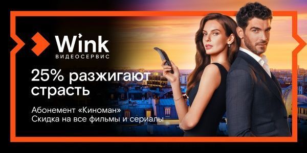 Абонемент «Киноман» — новое уникальное предложение видеосервиса Wink, которое позволяет смотреть все фильмы и сериалы, в том числе премьеры, с фиксированной скидкой 25%. «Киноман» станет безусловно выгодным приобретением для всей семьи — достаточно купить один абонемент, а пользоваться скидкой и смотреть контент на пяти экранах (телевизор, смартфон, планшет, ноутбук или компьютер) под одним аккаунтом могут все члены семьи.