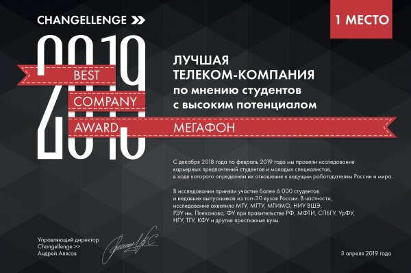 МегаФон занял первое место в номинации «Лучшая телекоммуникационная компания по мнению студентов с высоким потенциалом» в рейтинге Changellenge >> Best Company Award.