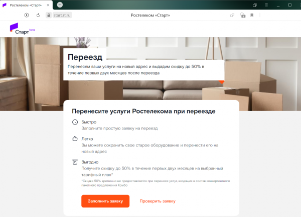 В рамках сервиса «Онлайн-переезд» у абонента сохранится история покупок и бонусов, а также необходимое оборудование (роутер и/или ТВ-приставка) со своими настройками. После переезда в течение двух месяцев клиенты «Ростелекома» получат 50% скидку на абонентскую плату.