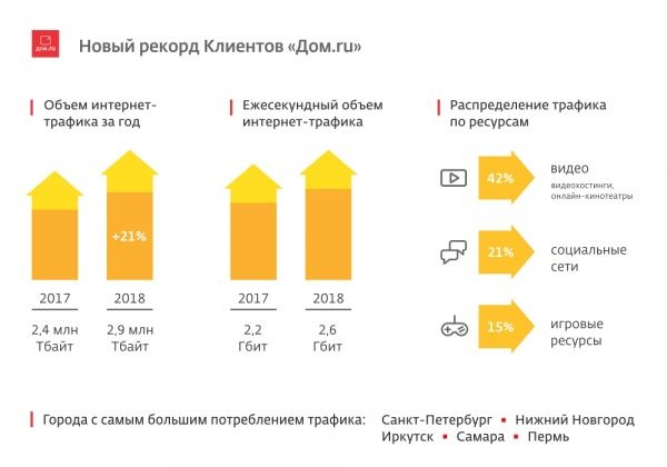 Объем интернет-трафика в сети телеком-оператора «Дом.ru» за год вырос на 21% по сравнению с 2017 годом и достиг более 2,9 млн Тбайт, что сопоставимо с просмотром 725 млн фильмов в Full HD-качестве. Каждую секунду через сеть компании проходит 2,6 Тбит трафика (в 2017 году – 2,2 Тбит).