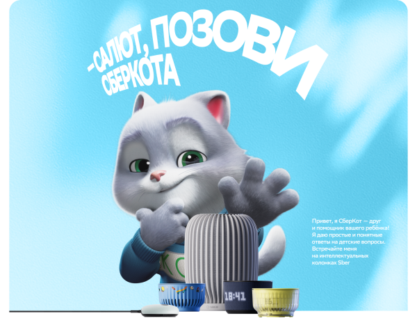 СберКот успел хорошо зарекомендовать себя в работе с детьми — как друг, с которым можно поговорить на разные темы, так и советчик по финансовым вопросам. В новой роли в качестве детского персонажа в колонках, он также поддерживает любознательность, дает полезные рекомендации, а еще включает музыку и проактивно вовлекает в беседу маленьких непосед. При этом разговаривает с ребёнком на одном языке и никогда не даст вредный совет, так как бережно подбирает формулировки при общении с детьми.