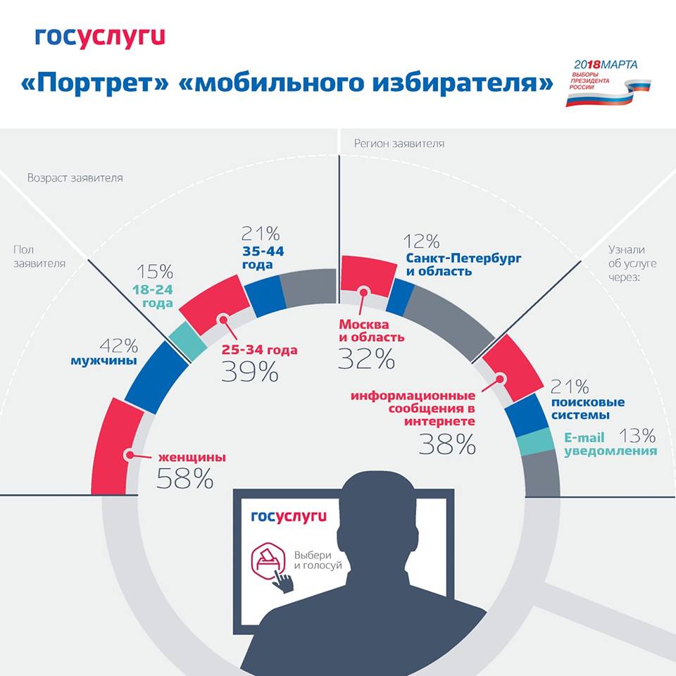 С 31 января по 12 марта 2018 года на Едином портале госуслуг работала услуга «Выбор избирательного участка на выборах Президента Российской Федерации», с помощью которой граждане РФ впервые могли в электронном виде подать заявление о включении в список избирателей по месту нахождения. По уточненным данным Минкомсвязи, за весь период через ЕПГУ было подано 1,64 млн. заявлений.