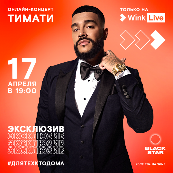 17 апреля в 19:00 по московскому времени российский рэп-исполнитель, певец и продюсер Тимур Юнусов, известный как Тимати, даст живой онлайн-концерт в видеосервисе Wink. На концерте прозвучат такие популярные хиты, как «Где ты, где я», «Не сходи с ума», «Понты», «Дерзкая», «Баклажан» и многие другие.