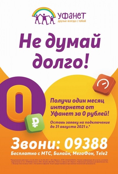 До 31 августа 2021 года для новых абонентов действует акция от "Уфанет": если вы оставили заявку на подключение интернета и кабельного ТВ в вашей квартире, то получите 1 месяц пользования этими услугами за 0 рублей!*