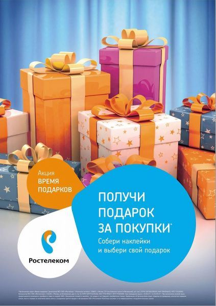 За подключение услуг «Ростелекома», покупку страховых продуктов, антивирусов, смартфонов или пополнение лицевого счета мобильных операторов (более установленной минимальной суммы) клиент получает наклейку. Наклейки обмениваются на подарки: