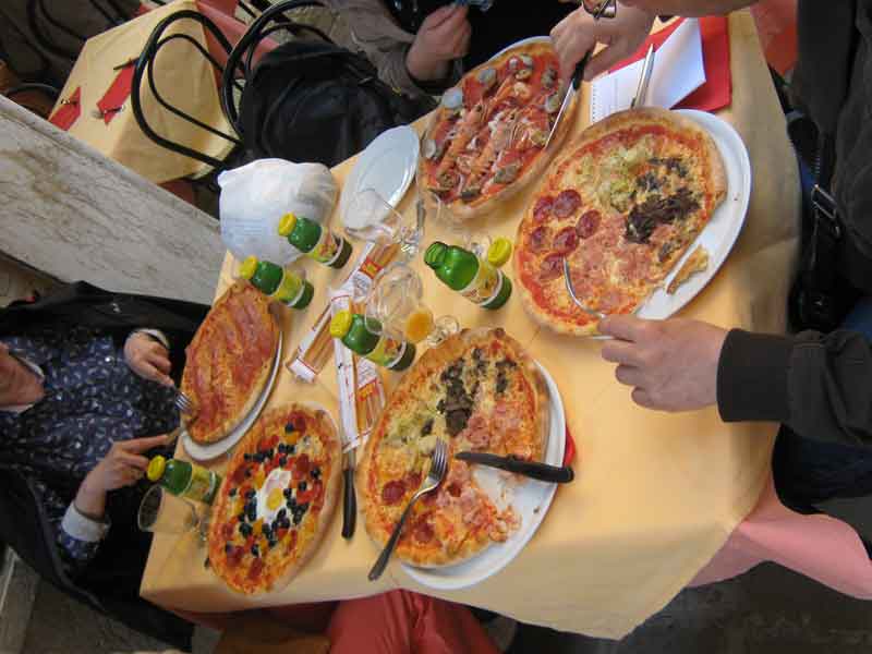 Обедать старались в кафе или пиццерии, хотелось попробовать настоящую итальянскую еду в родном ее исполнении. Местная кухня пришлась по вкусу, мне она показалась простой и очень вкусной благодаря обилию натуральных продуктов. Основные из них - мука, овощи, рыба, сыр, оливковое масло. Спагетти (или паста) подаются с многочисленными соусами, обилие которых и создает разнообразие блюд. В венецианском кафе нам подали блюдо внушительного размера с дымящейся пиццей. Ни с чем не сравнить этот аромат специй - насыщенный, терпкий, возбуждающий аппетит. (Пишу сейчас - и слюнки текут!)