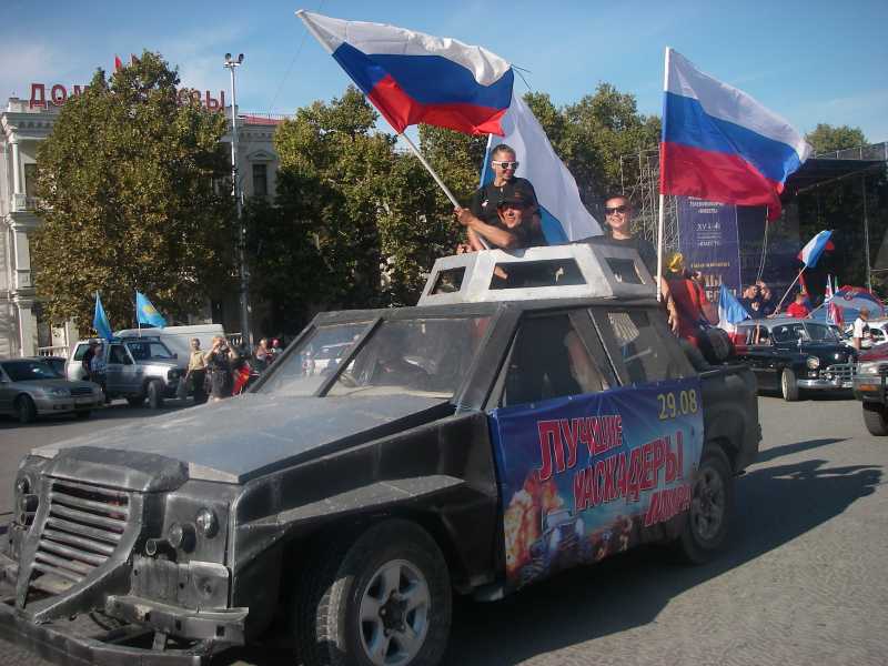 Тем, кто прибывает сюда, в первую очередь бросается в глаза, что в Крыму, как у нас в праздники, повсюду российские флаги: на общественных зданиях и жилых балконах, на крышах садовых домиков и дач. И даже в салонах автобусов, троллейбусов, маршруток - маленькие флажки. На центральной севастопольской площади Нахимова по-прежнему стоит большая сцена, которую в последнее время мы столько раз видели по телевизору. Здесь и сейчас проходят различные акции и мероприятия, и не только развлекательные. Повсюду говорят по-русски, почти все вывески и названия тоже на русском языке.