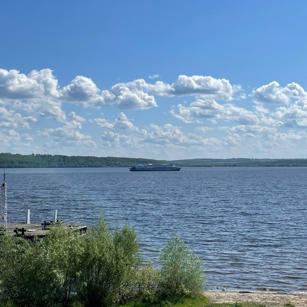 Четырехпалубный теплоход «Россия» круизной компании "Созвездие" сделал остановку около поселка Юрино в Марий Эл, путешествуя по Волге.