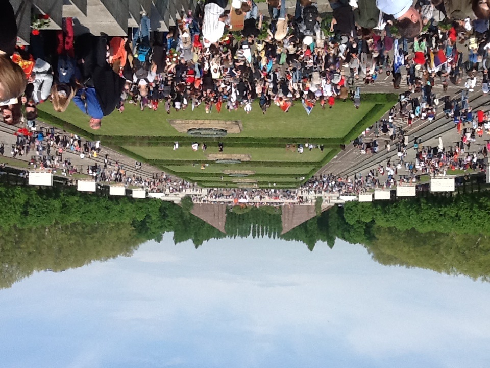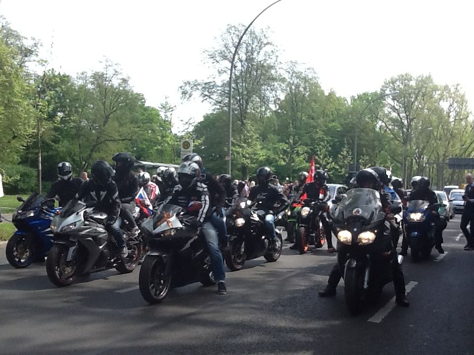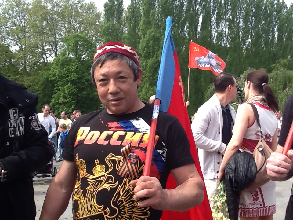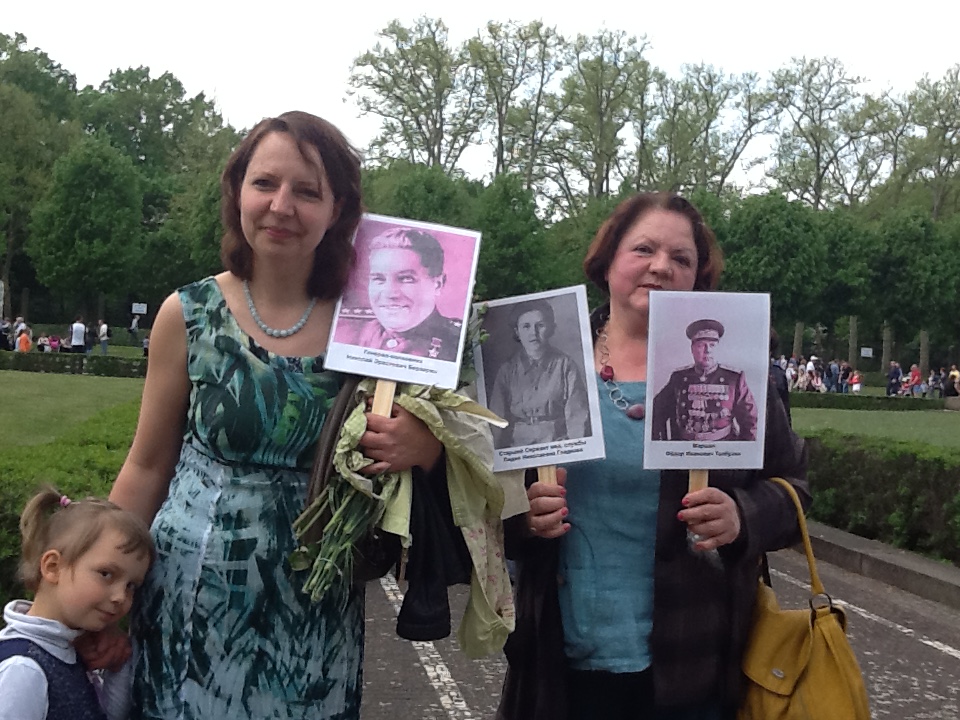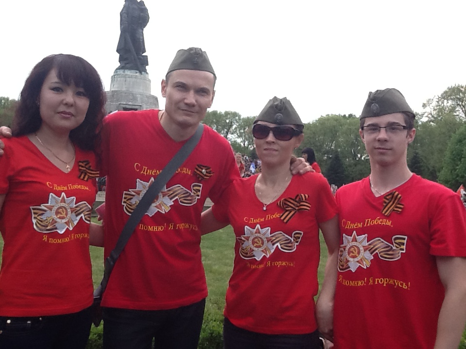 День Победы в Берлине праздновали десятки тысяч жителей Германии. А вокруг них российские триколоры, красные знамена Победы, белорусские флаги, знамена ВДВ, георгиевские ленточки у сердца. И там же все вместе - улыбающиеся старейшины с Кавказа, мужчины в казахских тюрбанах и в узбекских тюбетейках и наши «ночные волки». Мальчишки в форме моряков, девчонки в солдатском обмундировании и рядом с ними немецкие школьники в красных футболках «Помним! Гордимся!». Все немного усталые, но счастливые с флагами и букетами. А у памятников - венки на десятках языков - иероглифы, арабская вязь, латиница…И сотни участников Бессмертного полка…