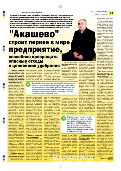 Предприятие, которое строит в Марий Эл агрохолдинг "Акашево", позволит не только превратить отходы производства птицы в ценнейшие удобрения, но и "вылечить" разрушенный плодородный слой почвы в Марий Эл, задействовать пустующие земли, вывести на новый уровень животноводство, перерабатывающую промышленность, дать достойно оплачиваемую работу десяткам тысяч людей. В том, что это произойдет уже в недалеком будущем, убежден автор технологий по производству экологически чистых органоминеральных удобрений, академик Геннадий КОСЬЯНЕНКО.