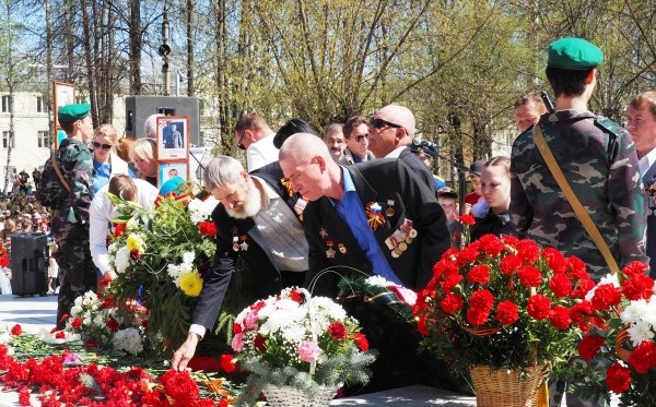 Еще одним эмоциональным моментом стало возложение цветов. Жители города несли алые гвоздики и тюльпаны со слезами на глазах. Горожане возложили цветы к обелиску, Стене Памяти, бюстам Героев Советского Союза, стеле 107 стрелковой бригады. После завершения памятного мероприятия в Парке Победа продолжилась праздничная программа с участием фронтовой бригады и духового оркестра.