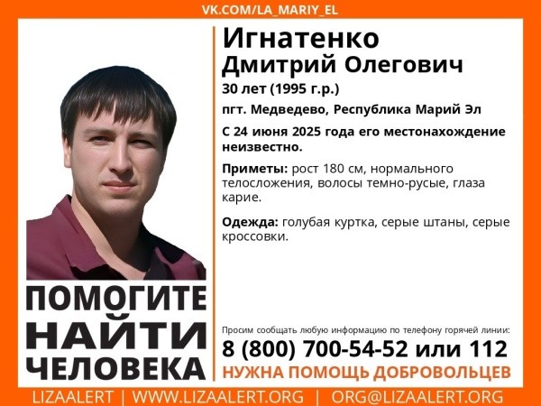 Пропал 30-летний Дмитрий Олегович Игнатенко из поселка городского типа Медведево. Его местонахождение неизвестно с 24 июня, сообщили в пресс-службе отряда «ЛизаАлерт».