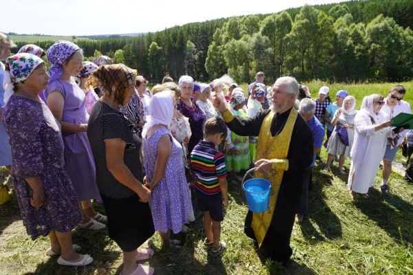 На почитаемом сельчанами месте – на живописной возвышенности местной плотины – в национальных нарядах Вера Григорьева и Валентина Павлова с караваем встречали собравшихся. Отец Леонтий вместе с отцом Алексием, настоятелем храма деревни Чодраял Волжского района, совершили чин освящения родника, окропили всех водой. Поблагодарили тех, кто вложил труд и деньги в обустройство крытой площадки над источником.