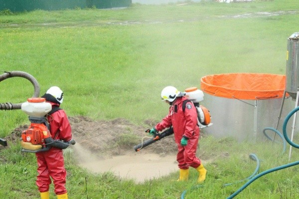 По легенде учения, из-за атаки беспилотника автоцистерна с нефтепродуктами опрокинулась в кювет, в корпусе образовалась трещина и около 18 тонн нефтепродуктов разлились.
