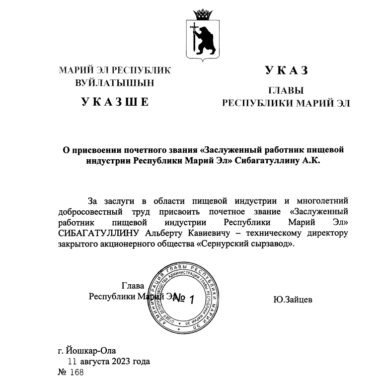 Указ подписан от 11 августа. Звание техническому директору закрытого акционерного общества «Сернурский сырзавод» присвоили за заслуги в области пищевой индустрии и многолетний труд, сообщается в документе.