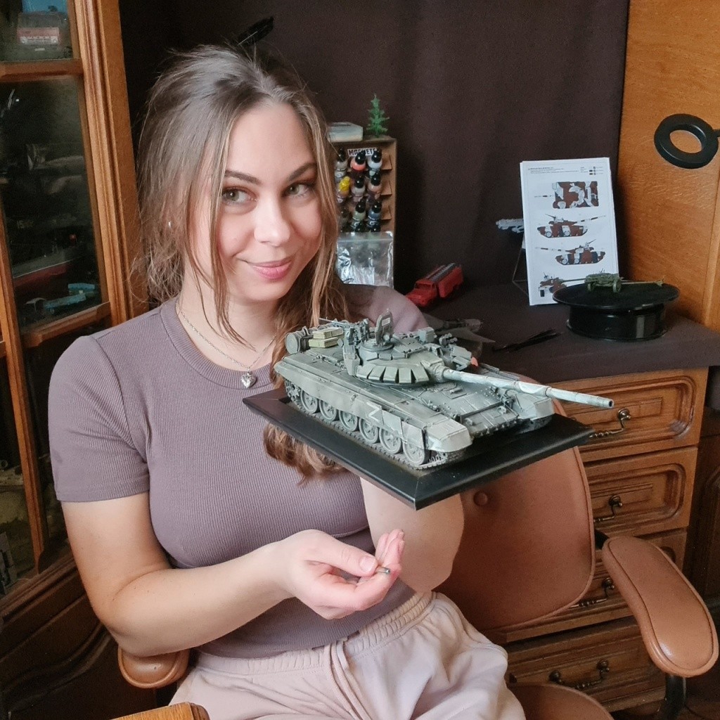 ‒ Ко мне часто обращаются люди с просьбами сделать для них модель, особенно интересно для заказчика, что мои модели получаются некими знаменитостями, благодаря участию их в моих видео. Так и произошло и тут. Меня попросили сделать модель, изображающую российский танк Т-72Б3 во время боевых действий на Украине. Мне было интересно, благо, прототипы выглядят довольно «харизматичными» благодаря надписям, которые делают танкисты на своих боевых машинах. Изначально я хотела сделать образец с личным именем Victoria's Secret. Он засветился на некоторых кадрах во время боев за Мариуполь. Видно было, что танкисты с юмором подошли к этой надписи, и мне хотелось сделать именно эту машину. Но в процессе я поняла, что начала работать над другой версией танка Т-72Б3 (у них есть определённые отличия). И у меня не получится сделать тот танк из Мариуполя, ‒ рассказала Дарья в личной беседе.