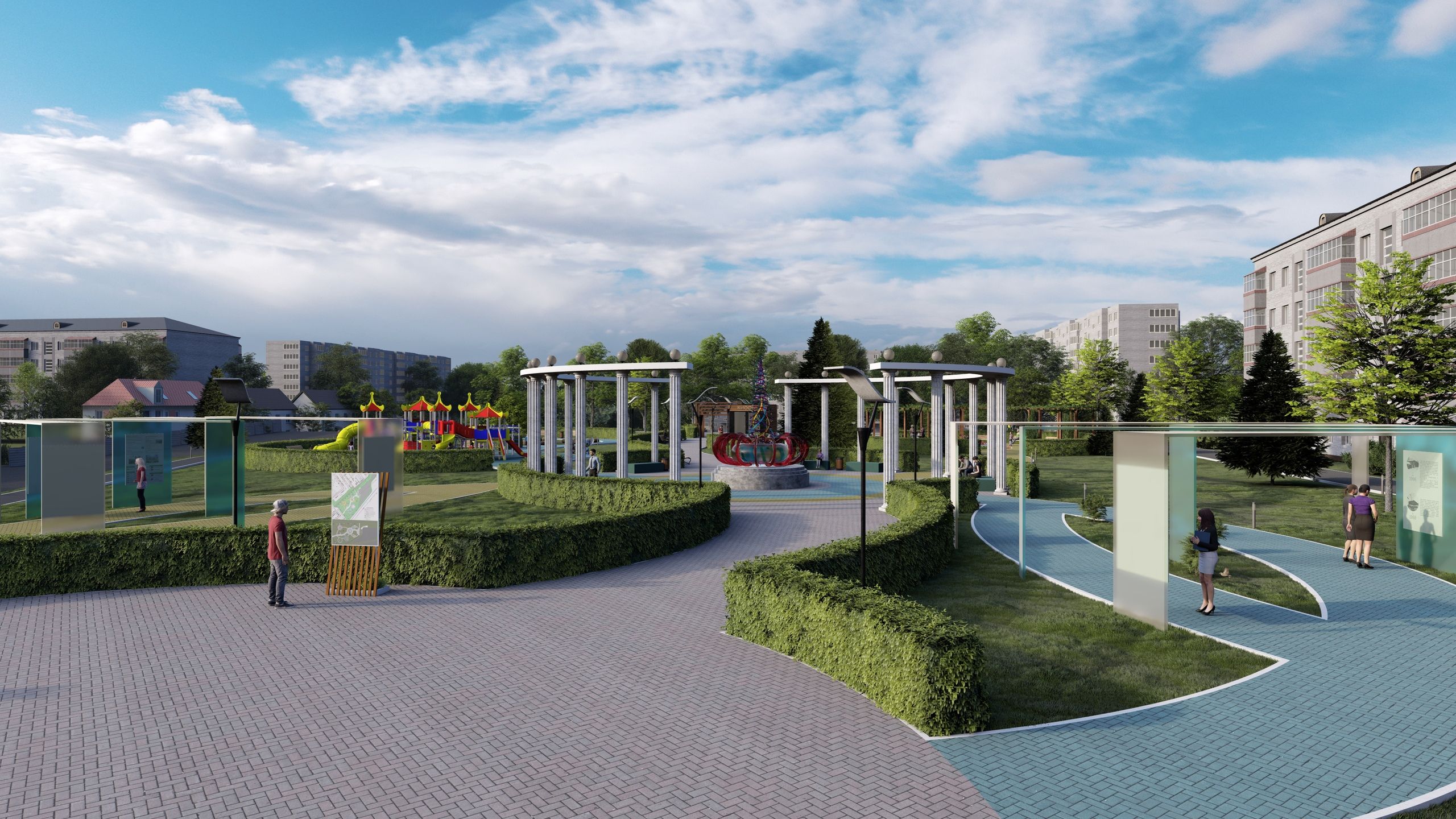 Сквер будет поделен на зоны: познавательную, развлекательную, спортивную и зону тихого отдыха. А в центре сквера будет установлена архитектурная композиция.