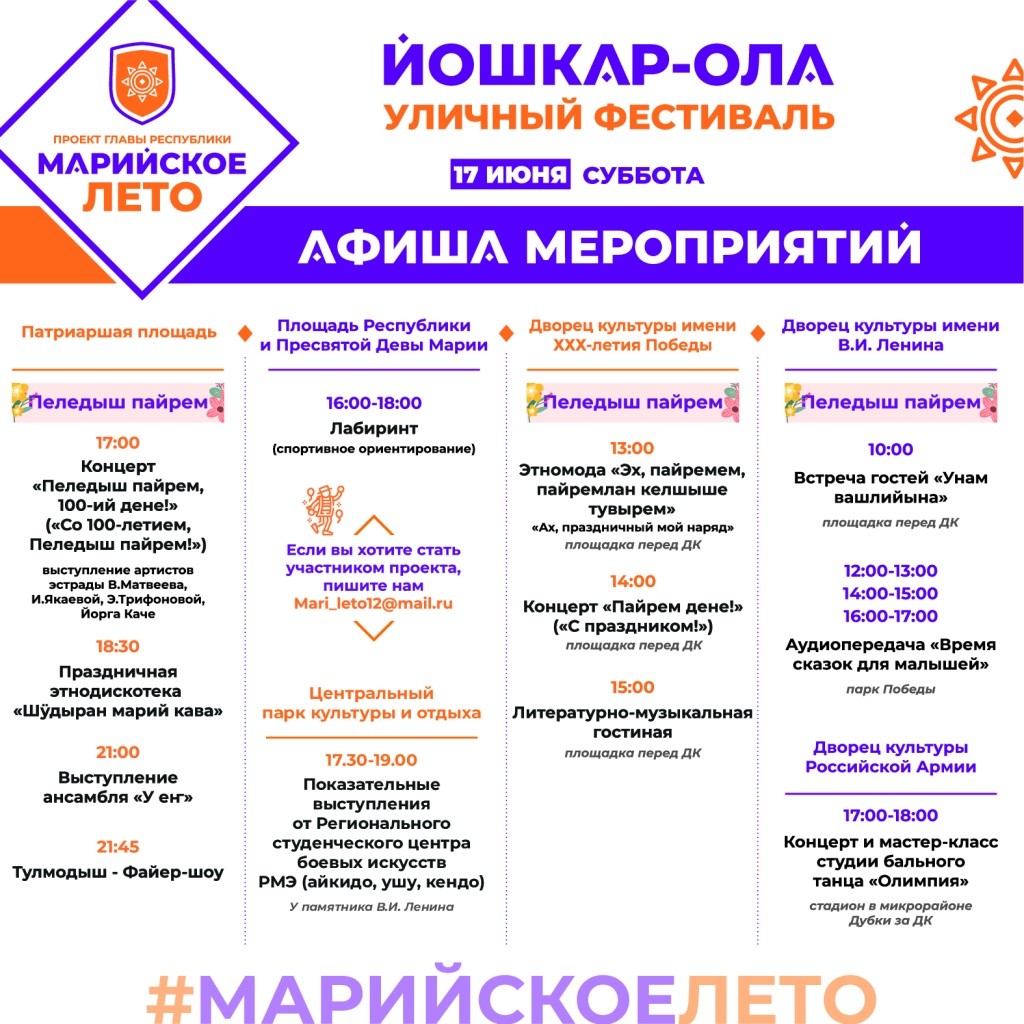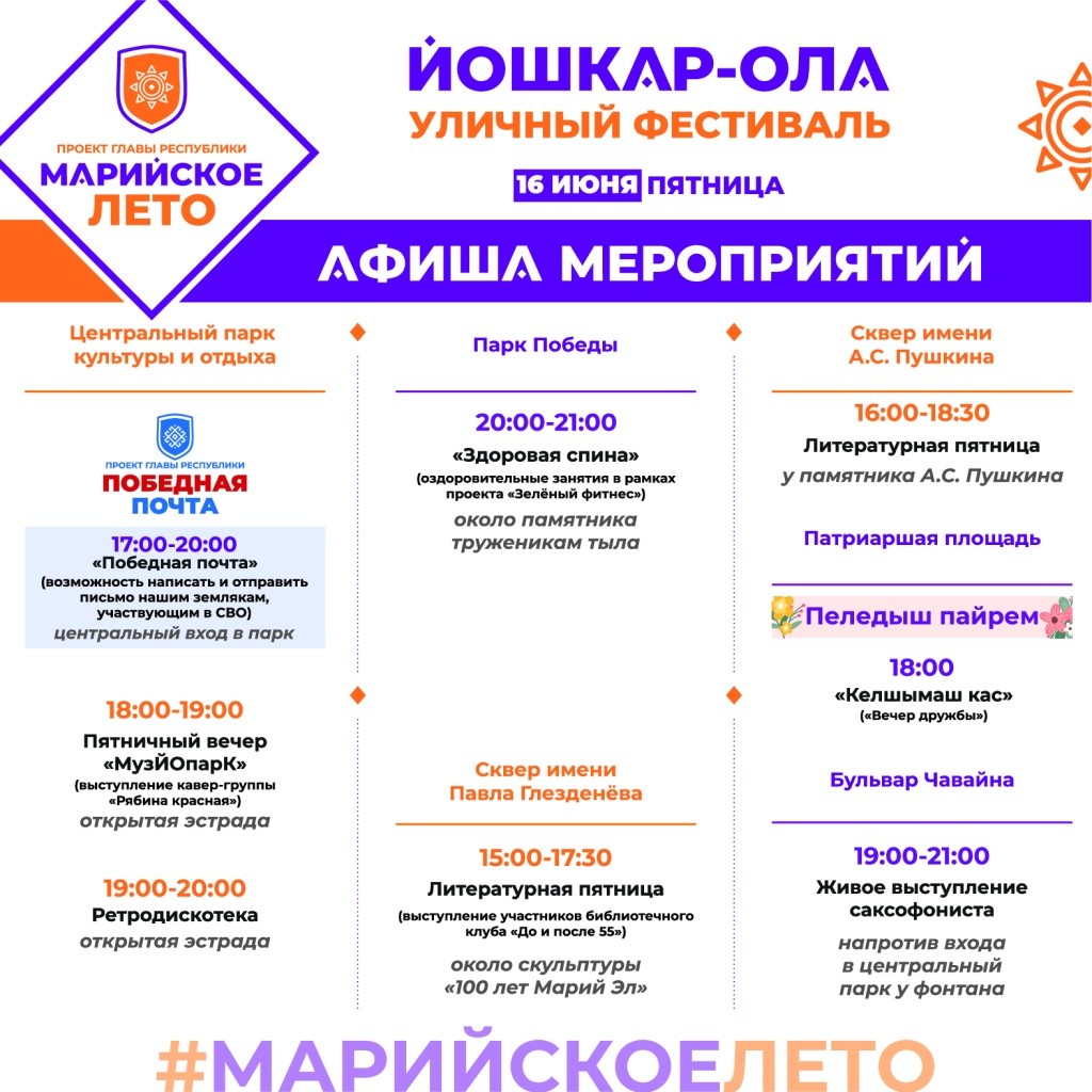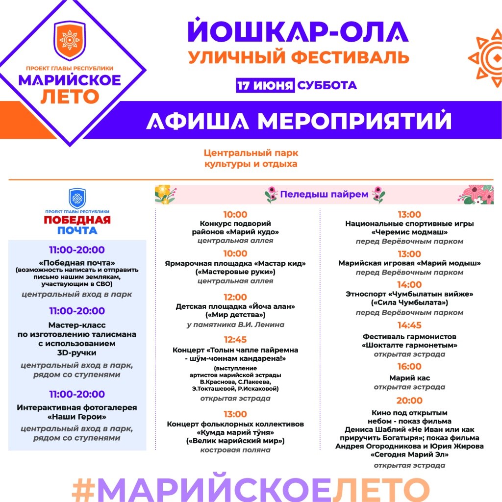Опубликована подробная афиша событий «Марийского лета» 16-18 июня. В программе – культурные, спортивные события, а также акция «Победная почта» и мероприятия праздника «Пеледыш пайрем».