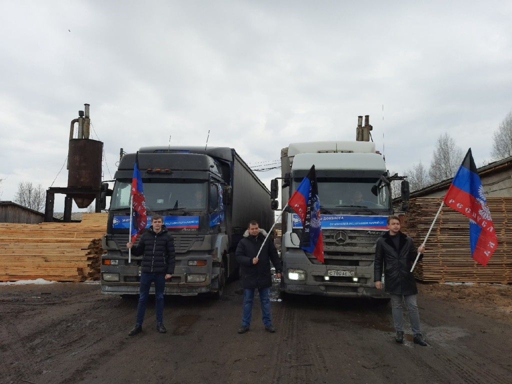 Когда машины с наклейками «Жителям Донбасса от жителей Республики Марий Эл» на лобовых стеклах уезжали со стоянки от Мышино, в воздухе развевались флаги с надписью «Донецкая республика» и гербом России.