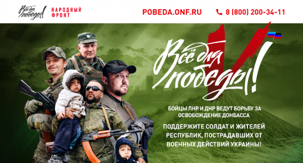 «Словом, как говорится: «Все для фронта! Все для Победы!» И не случайно запущенный недавно Общероссийским народным фронтом проект так и называется «Всё для победы». Сегодня мы все должны поддержать, как население ДНР и ЛНР, так и воинские подразделения народных республик», – подчеркнул Владимир Белоусов.