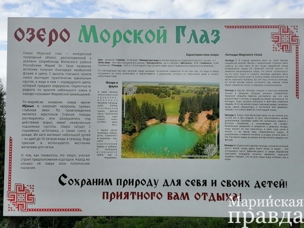 Людмила Леонтьевна рассказывает, что сама впервые увидела это озеро, когда привезла сюда своих учеников из Моркинского района. Говорит, тогда от этой красоты дух захватило и душа, словно ахнула. Поразила ее тогда исключительная красота, созданная природой: необычный, глубокий бирюзовый цвет воды и красивейшие деревья по берегу, словно ресницы обрамлявшие Глаз. А потом в 1982 году судьба распорядилась так, что женщина приехала сюда на родину отца и стала работать в местной школе учителем русского языка. Да еще и жить ей посчастливилось на возвышенности, буквально рядом с Морским Глазом, метрах в пятидесяти.